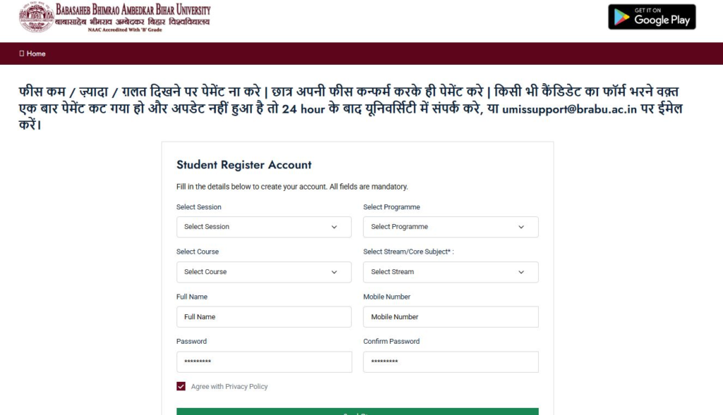 सबसे पहले, आपको बाबासाहेब भीमराव अम्बेडकर बिहार विश्वविद्यालय की एडमिशन पोर्टल की ऑफिशियल वेबसाइट पर जाना होगा: