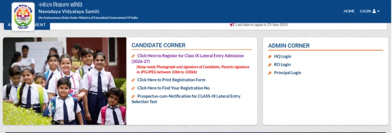 - रजिस्ट्रेशन लिंक खोजें: वेबसाइट के होमपेज पर, ‘Candidate Corner’ सेक्शन में जाएँ। आपको “Click Here to Register for Class XI Lateral Entry Admission (2026-27)” जैसा एक लिंक दिखाई देगा। इस पर क्लिक करें।