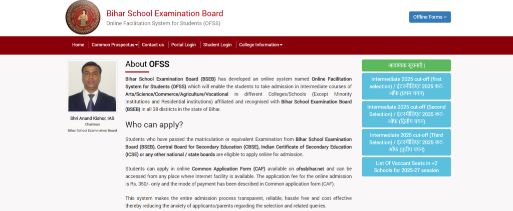 - सबसे पहले, आपको बिहार बोर्ड इंटर स्पॉट एडमिशन की आधिकारिक वेबसाइट (inter.ofssbihar.in) पर आना होगा।